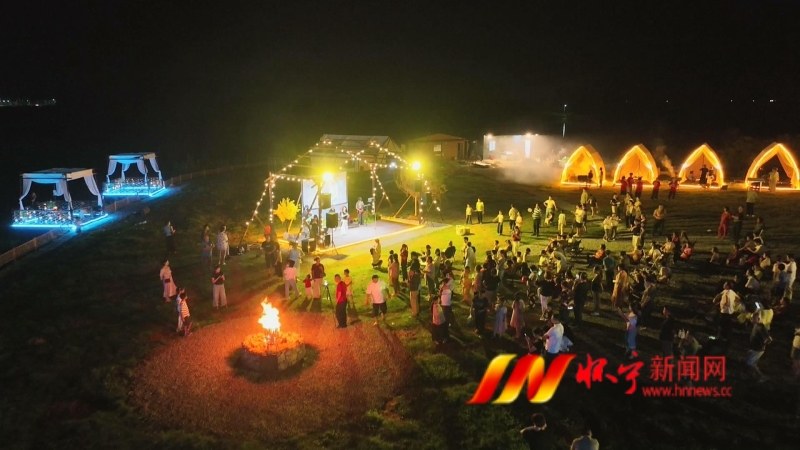 夜幕降臨,洪鋪鎮云下湖畔營地篝火燃起、煙花綻放、鐵花飛舞,樂隊演奏聲與游客歡笑聲此起彼伏。來自周邊地區的游客攜家帶口,漫步湖畔草地,暢玩水上項目,在豐富多彩的活動中享受美好假期。