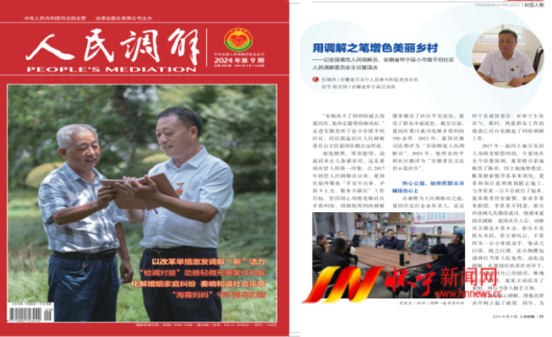 本網(wǎng)訊 近日,小市鎮(zhèn)平坦社區(qū)人民調(diào)解委員會(huì)主任夏國慶榮登由司法部主管的《人民調(diào)解》雜志(2024年第9期)封面。雜志還刊發(fā)了人民調(diào)解工作經(jīng)驗(yàn)文章——《用調(diào)解之筆增色美麗鄉(xiāng)村——記全國模范人民調(diào)解員、安徽省懷寧縣小市鎮(zhèn)平坦社區(qū)人民調(diào)解委員會(huì)主任夏國慶》,這是我縣首位人民調(diào)解員先進(jìn)事跡被該雜志宣傳報(bào)道。夏國慶目前擔(dān)任小市鎮(zhèn)平坦社區(qū)黨總支書記、居民委員會(huì)主任、社區(qū)人民調(diào)解委員會(huì)主任,2023年10月份獲得司法部表彰的“全國模范人民調(diào)解員”稱號(hào),并作為安徽省唯一一名“全國模范人民調(diào)解員”代表參加全國調(diào)解工作會(huì)議。(通訊員 祝節(jié) )