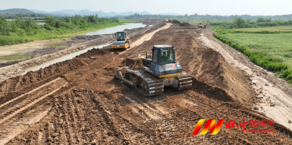 大沙河后續(xù)防洪治理工程(懷寧段)施工現(xiàn)場,數(shù)臺大型機(jī)械馬力全開,來回穿梭,工人們加緊新堤防修建作業(yè),全力搶工期、趕進(jìn)度。