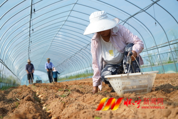 來到臘樹鎮芝嶺村,路邊的現代化鋼結構塑料蔬菜溫室十分醒目。走進蔬菜基地,溫室大棚內幾十名村民正在種植小馬鈴薯,半透明薄膜下茁壯成長的幼苗若隱若現。